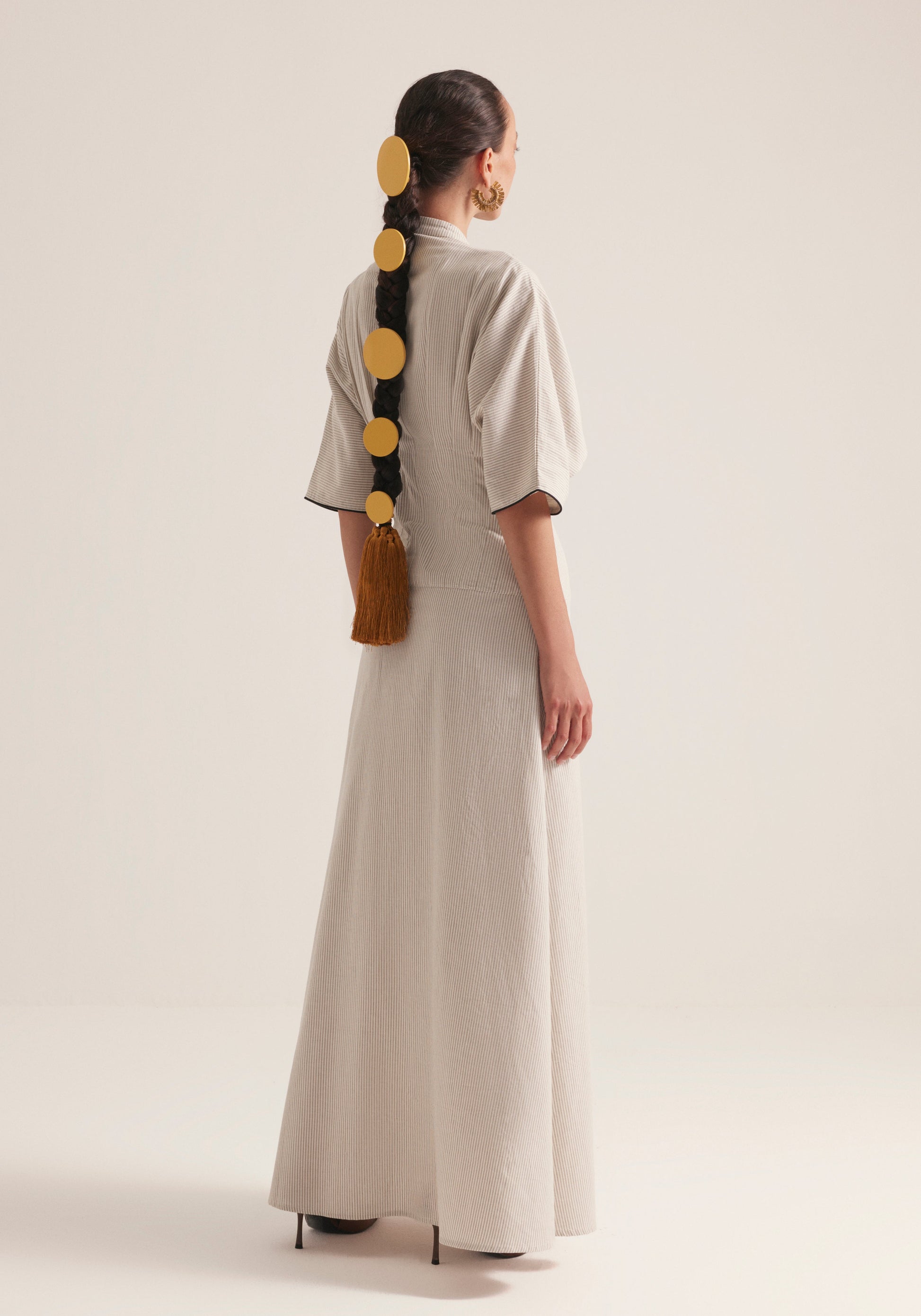 Reflecting Nora Al Shaikh’s approach to chic tailoring, our modern interpretation of the traditional kaftan features a fitted waist, kimono sleeves, and contrasting cord embellishment.